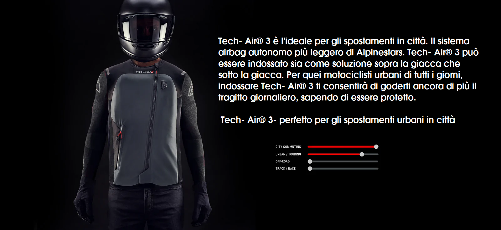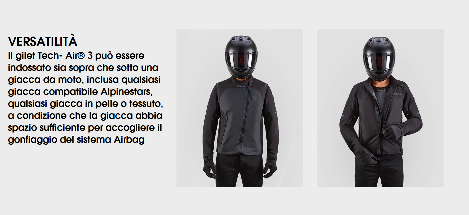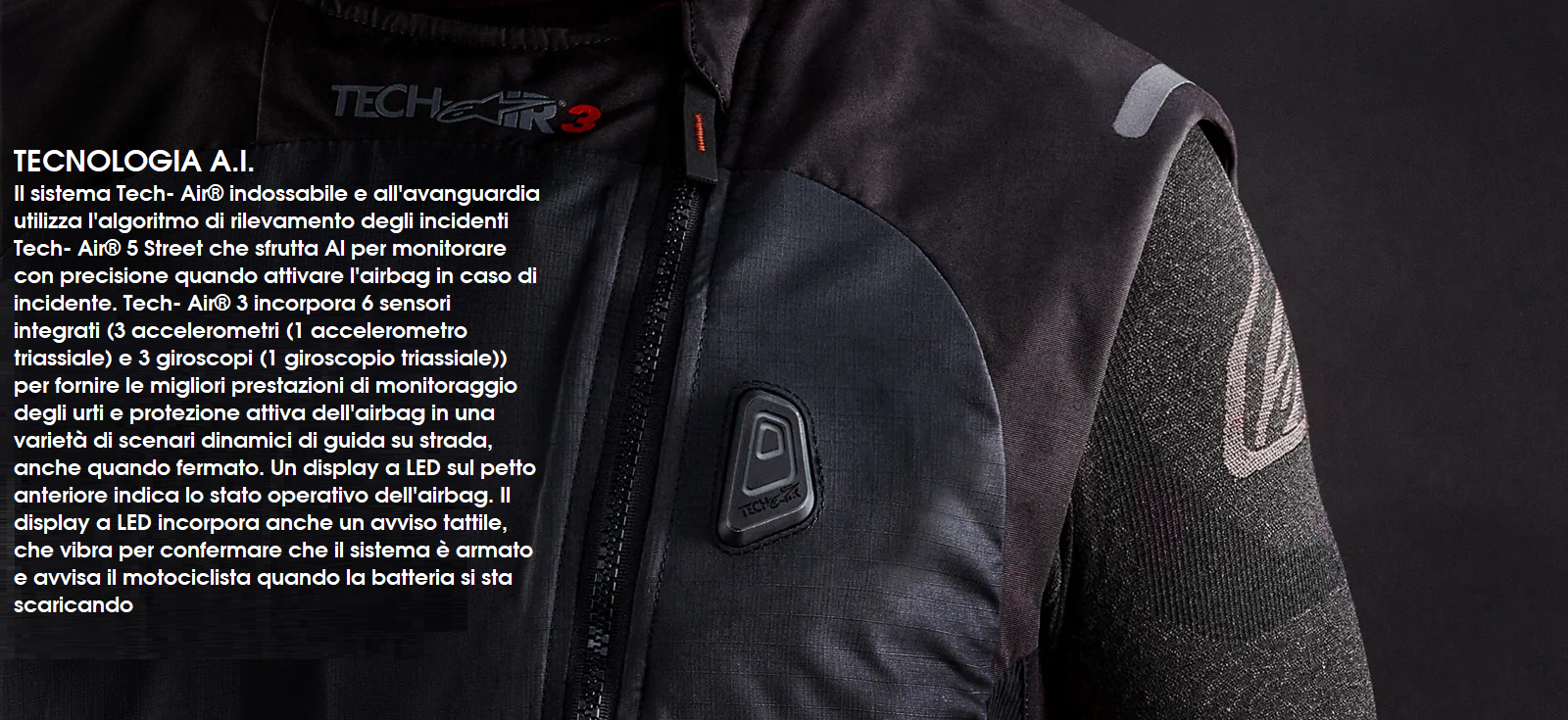 • Tech-Air® 3 è un sistema airbag attivo completamente autonomo e non richiede alcun collegamento o sensore esterno sulla motocicletta per il funzionamento del sistema.