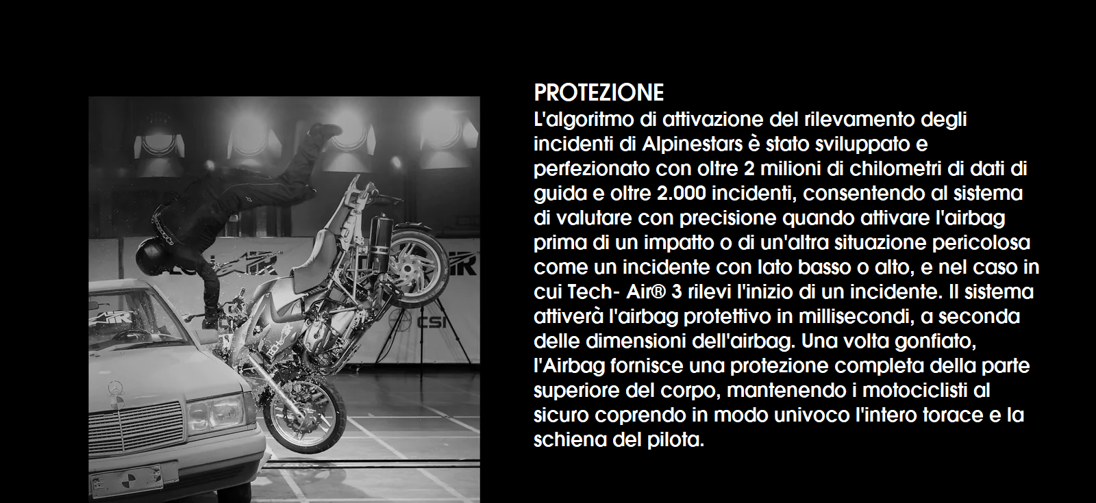 L'algoritmo di attivazione del rilevamento degli incidenti di Alpinestars è stato sviluppato e perfezionato con milioni di chilometri di dati di guida e migliaia di incidenti, consentendo al sistema di valutare con precisione quando attivare l'airbag prima di un impatto o di altre situazioni pericolose come un incidente con lato basso o alto. Nel caso in cui Tech-Air® 3 rilevi l'inizio di un incidente, il sistema gonfierà l'airbag protettivo in 50 millisecondi. In caso di impatto diretto della motocicletta con un altro veicolo o ostacolo, il Sistema Tech-Air® 3, ​​è efficace per il “primo impatto*”, ovvero il Sistema si gonfia prima di urtare il veicolo o l'ostacolo contro il quale la motocicletta avrà l'impatto diretto. Il test di "primo impatto" è stato eseguito in conformità con il protocollo Dolomiticert in cui l'airbag è stato testato in un intervallo di velocità compreso tra 25 e 63 km/h. Dotato di un telaio principale resistente all'acqua e di una ECU e di un'elettronica impermeabili, il sistema sottile e autonomo può anche essere indossato sotto una giacca da moto, inclusa una giacca Tech-Air® Ready di Alpinestars, o qualsiasi giacca in pelle o tessuto, a condizione che il la giacca ha spazio sufficiente per accogliere il gonfiaggio dell'airbag. Tech-Air® 3 consentirà ai motociclisti di godersi ancora di più il tragitto giornaliero, sapendo di essere protetti.