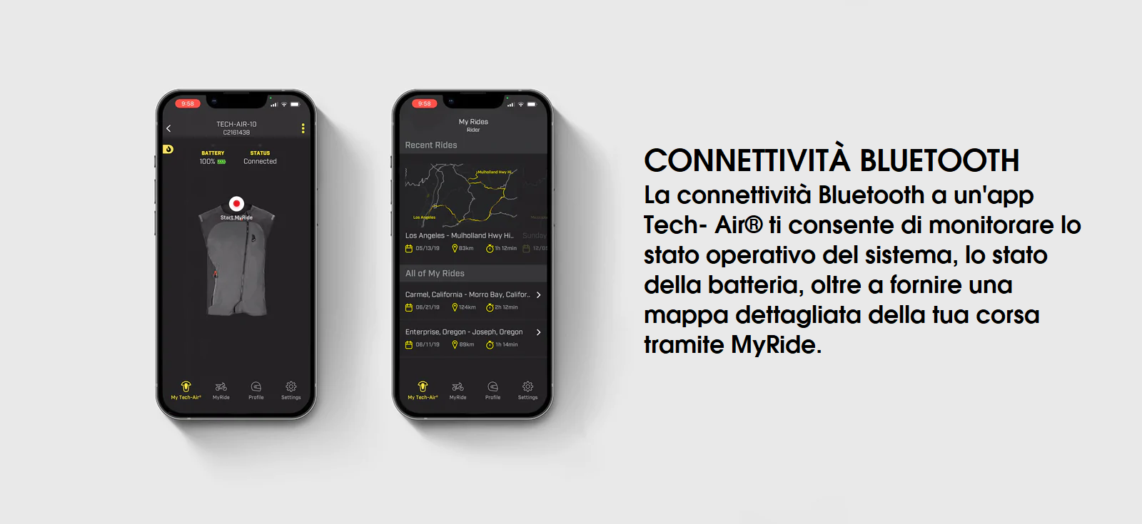 • La connettività Bluetooth Low Energy (BLE 5.0) all'app Tech-Air® consente ai motociclisti di monitorare lo stato operativo del sistema, lo stato della batteria, oltre a fornire una mappa dettagliata delle corse dei motociclisti tramite MyRide.