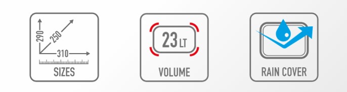 • Copertina antipioggia in materiale giallo fluorescente, inserita dalla tasca posteriore